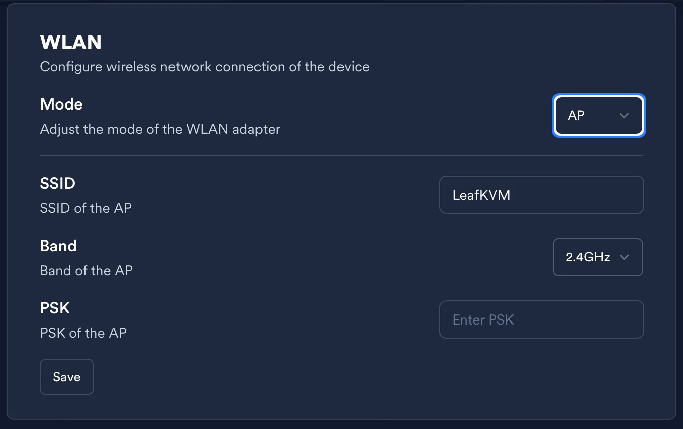 Section titled “Option A: LeafKVM Creates a Wi-Fi Hotspot”LeafKVM can act as a Wi-Fi access point: