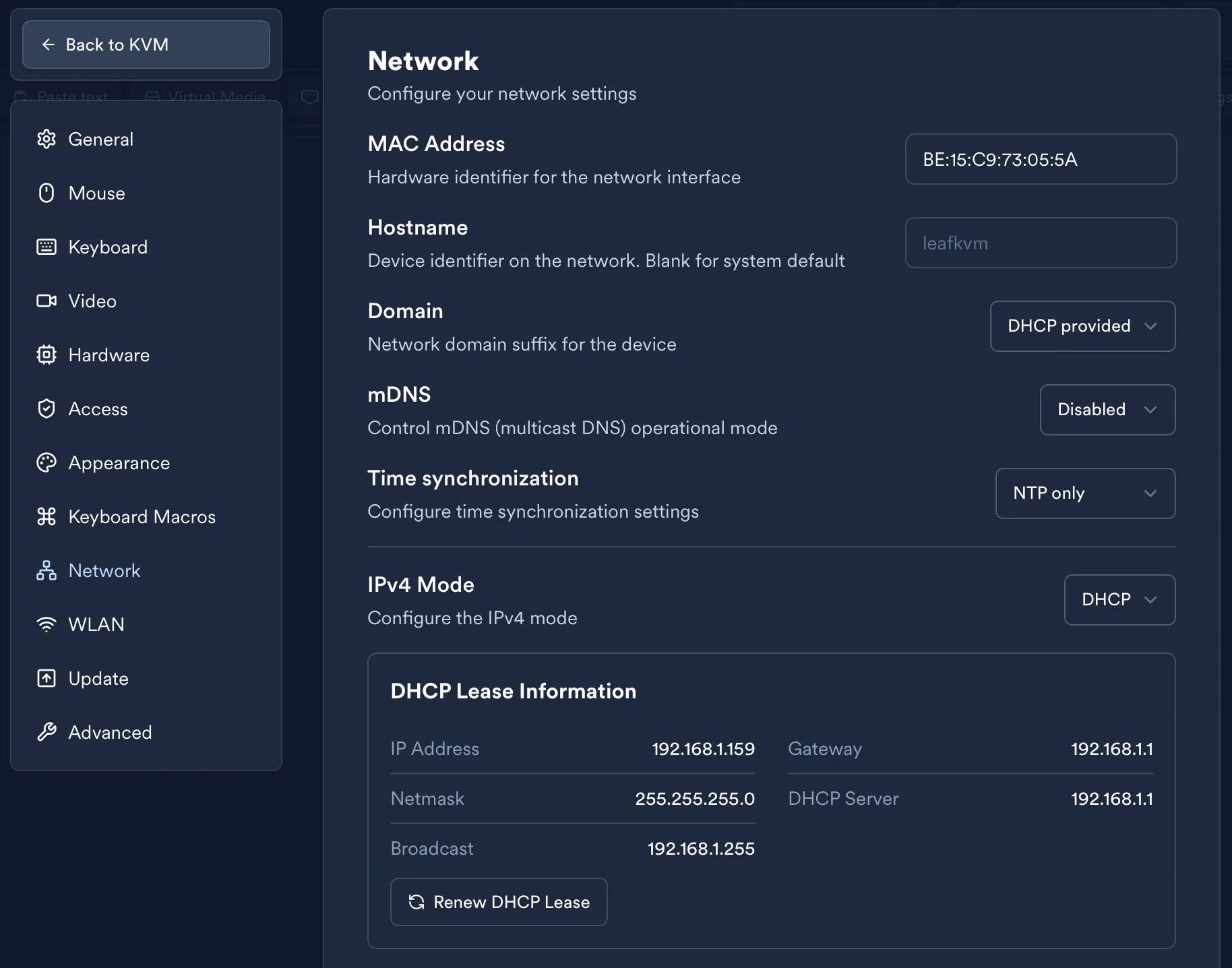 LeafKVM requests an IP address from your router automatically.