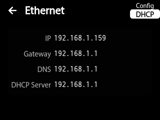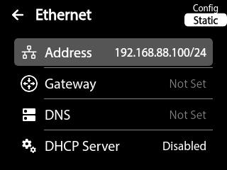 The Ethernet menu allows configuration of wired networking with three selectable modes: