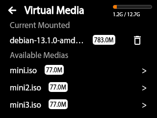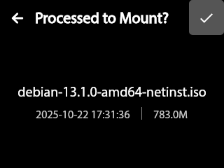 If Mass Storage is enabled (configured via the Web UI), available system images can be mounted or unmounted directly from the touchscreen.