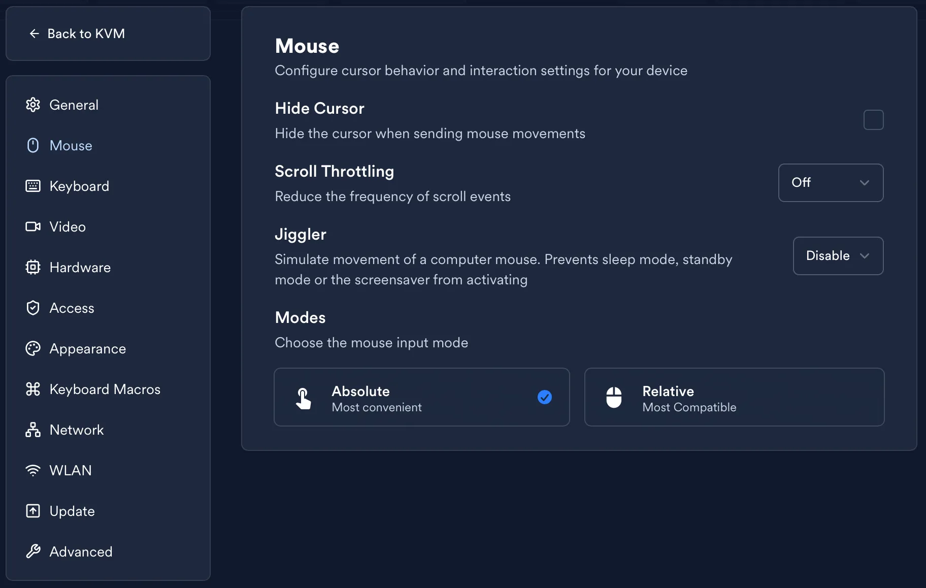 Section titled “Mouse Modes”LeafKVM supports two input modes for broad compatibility: